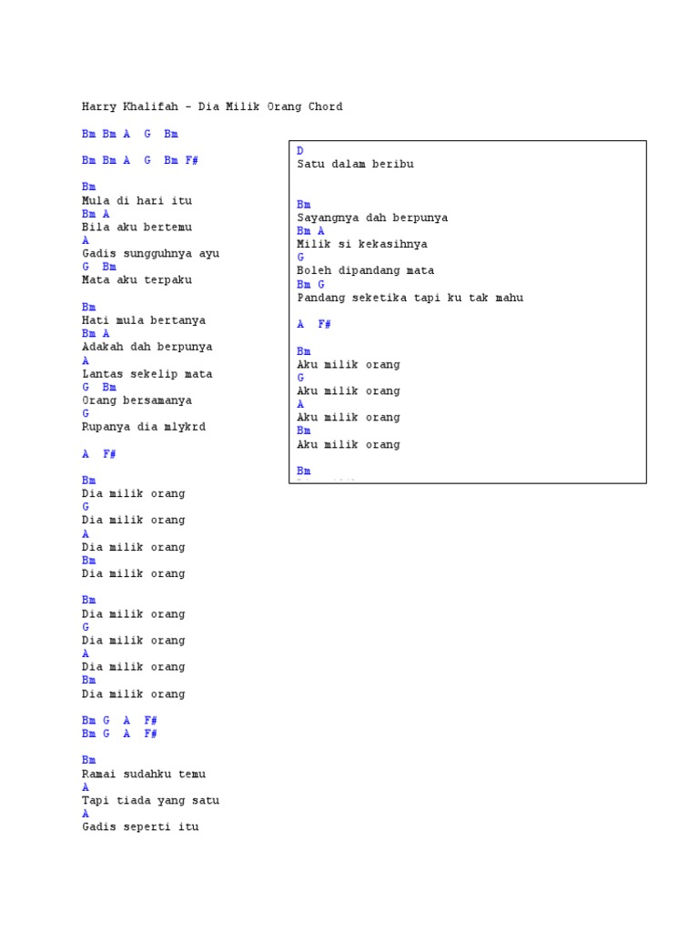 Lagu tersebut diciptakan oleh Fredy selaku sahabatnya. Chord Gitar dan Lirik Lagu Dia. Lyrics for dia milik orang by harry khalifahC g am em f g c dm kau mau apa pasti kan ku beri g c kau minta apa akan ku turuti am f g c walau harus aku terlelah dan letih am f g ini demi kamu sayang reff.